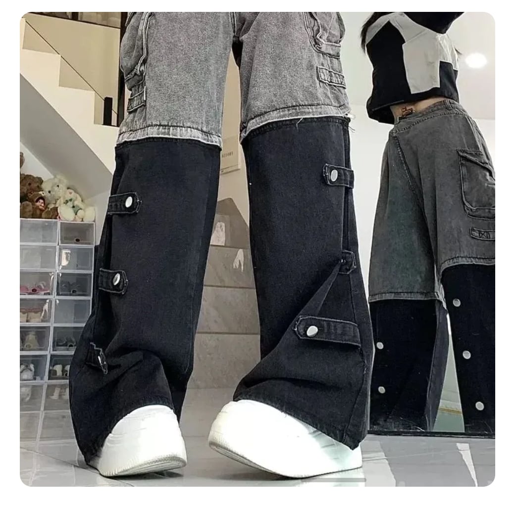切り替え カーゴパンツ ワイドパンツ デニム バイカラー ブラック ストリート