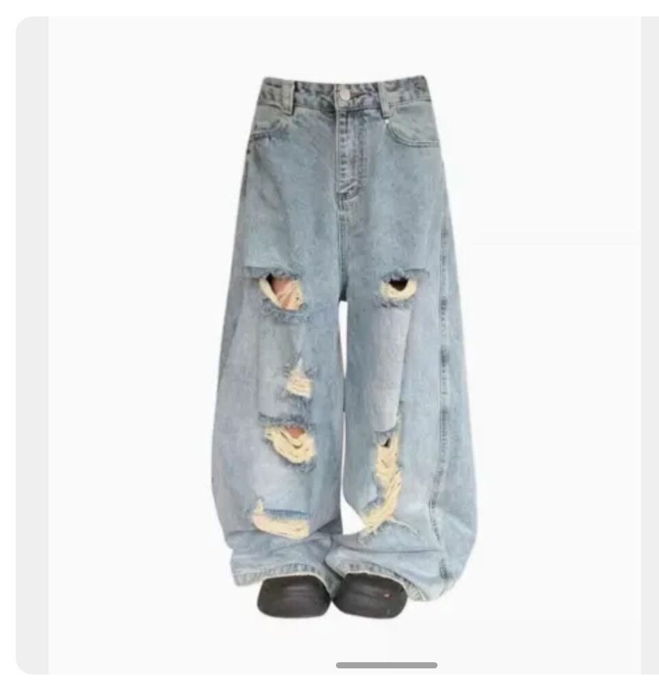 大胆なダメージ加工が目を引く、ゆったりシルエットのデニムパンツです。
