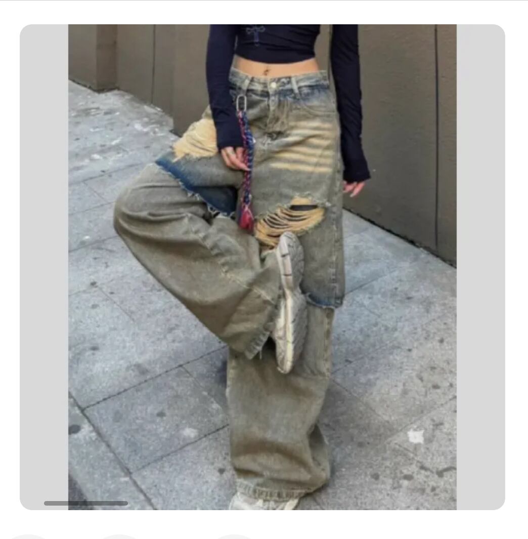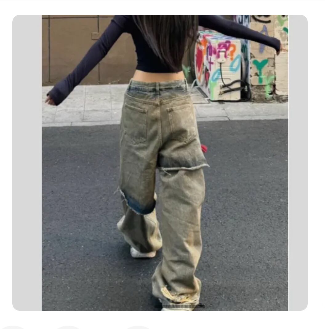 ダメージワイドデニムパンツ ユニーククラッシュ ストリート オーバーサイズ ヴィンテージ加工