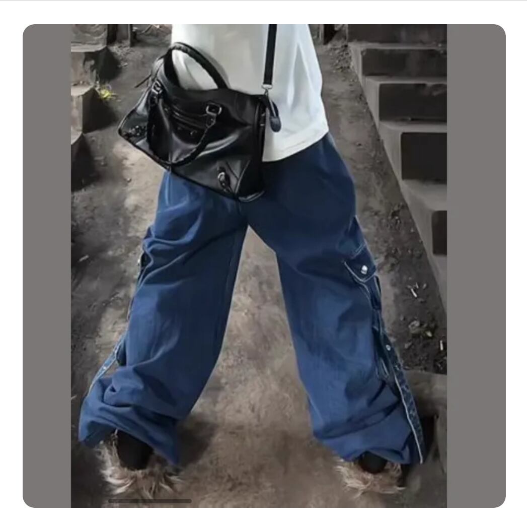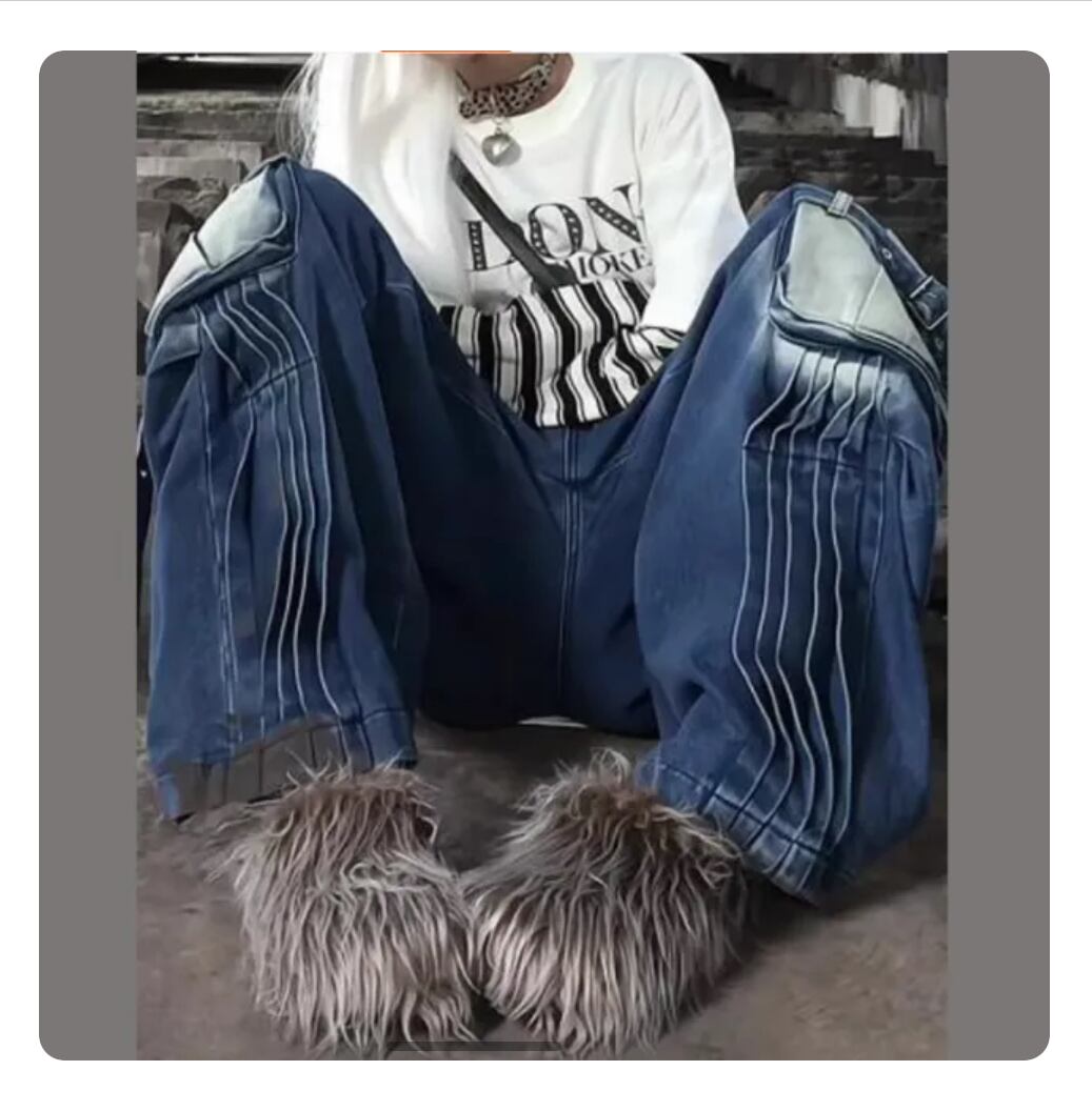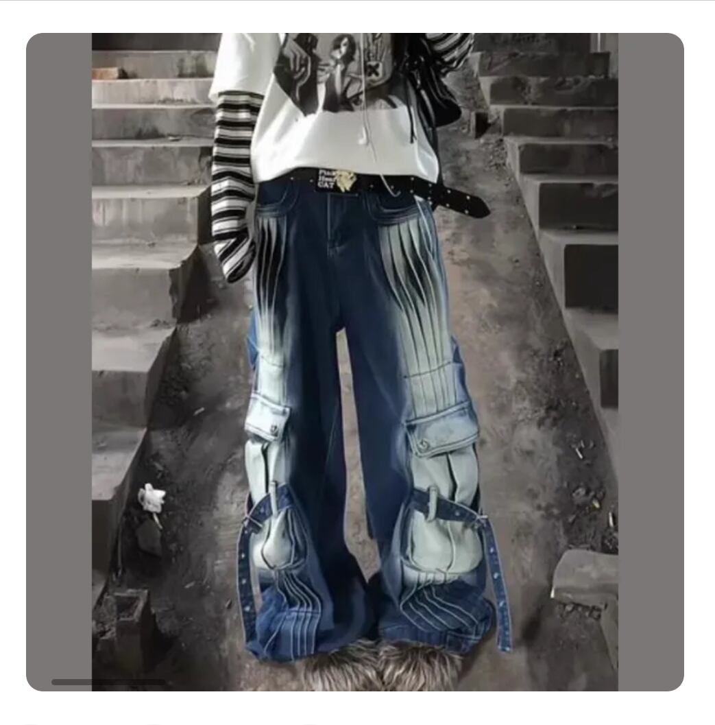 ワイドデニムパンツ プリーツ ユニーク ダメージ加工 ユニセックス サイバーパンク オーバーサイズ
