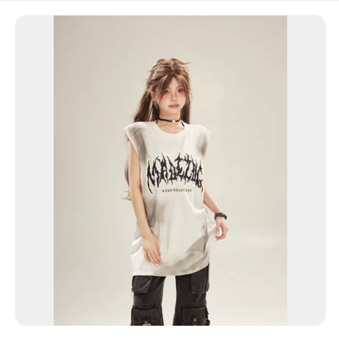 グラフィックロゴが目を惹くノースリーブトップス。