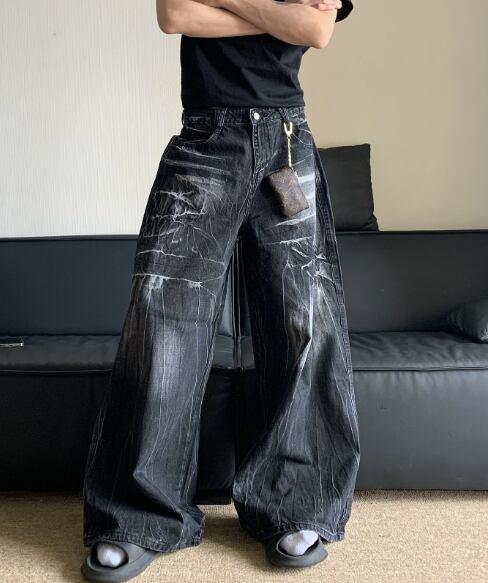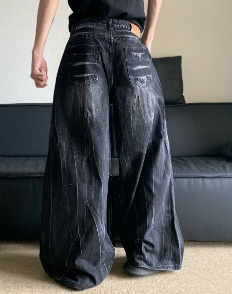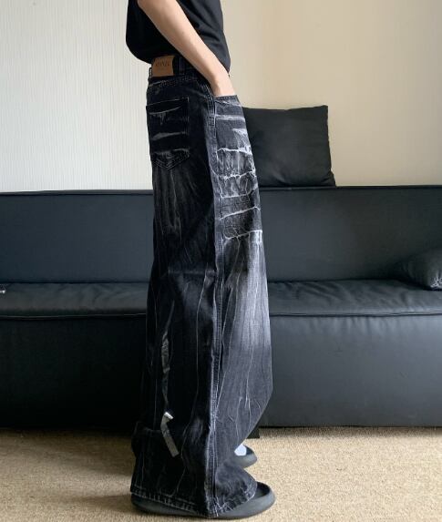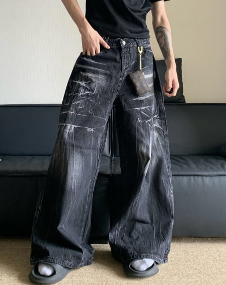 ユーズドウォッシュ ワイドデニムパンツ ダメージ 個性派 韓国風 ストリート