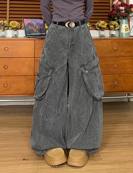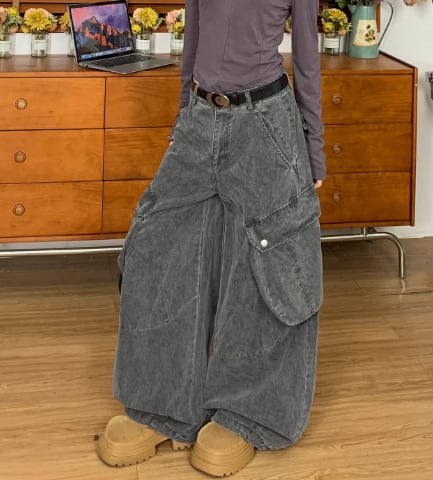 ダメージデニム カーゴパンツ ヴィンテージ加工 ワイドレッグ ストリート