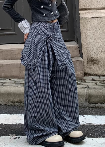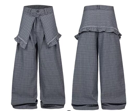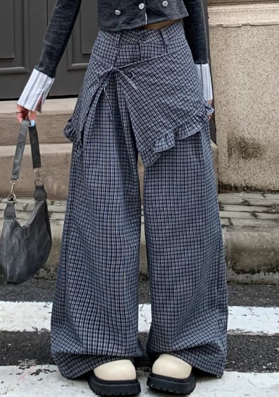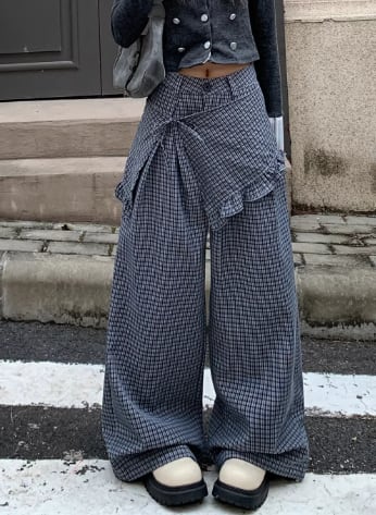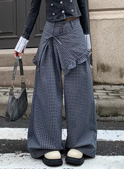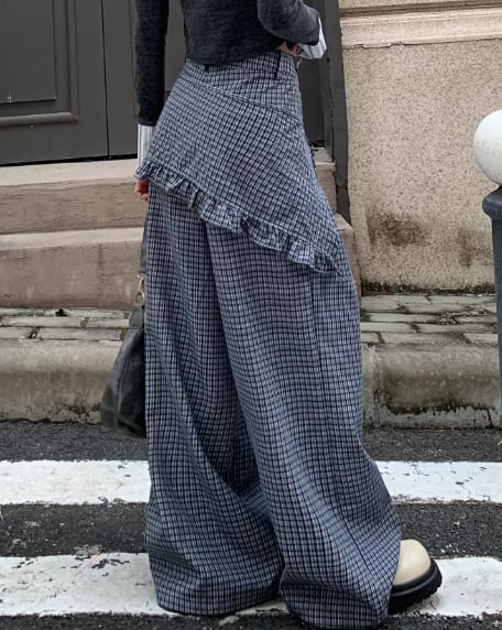 アシメフリルレイヤード グレンチェックワイドパンツ ラップデザイン 個性派