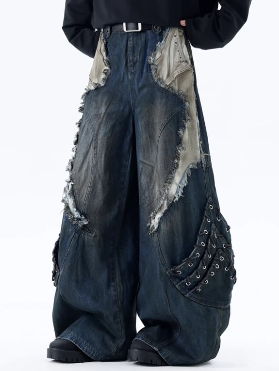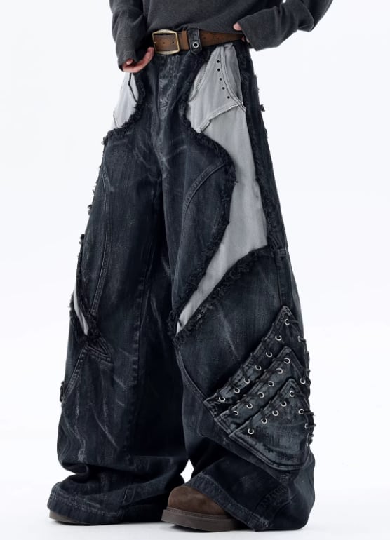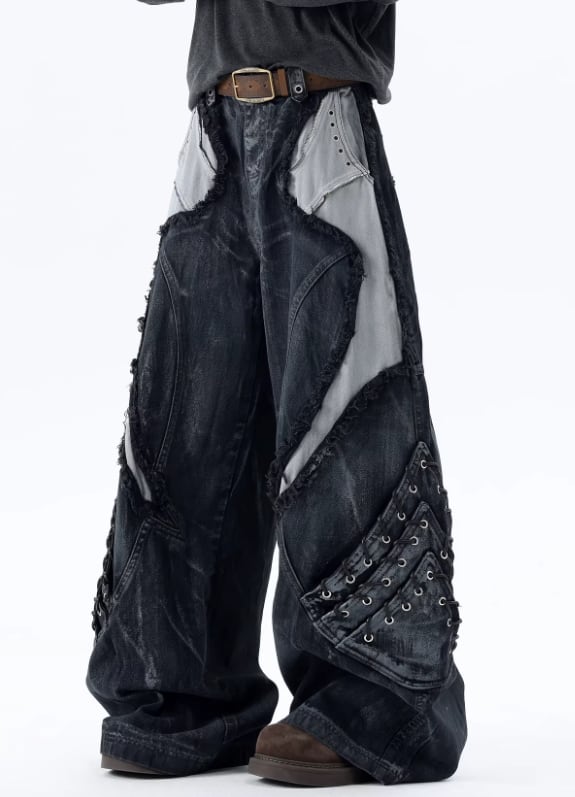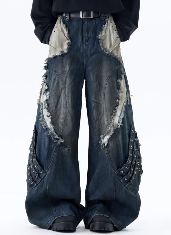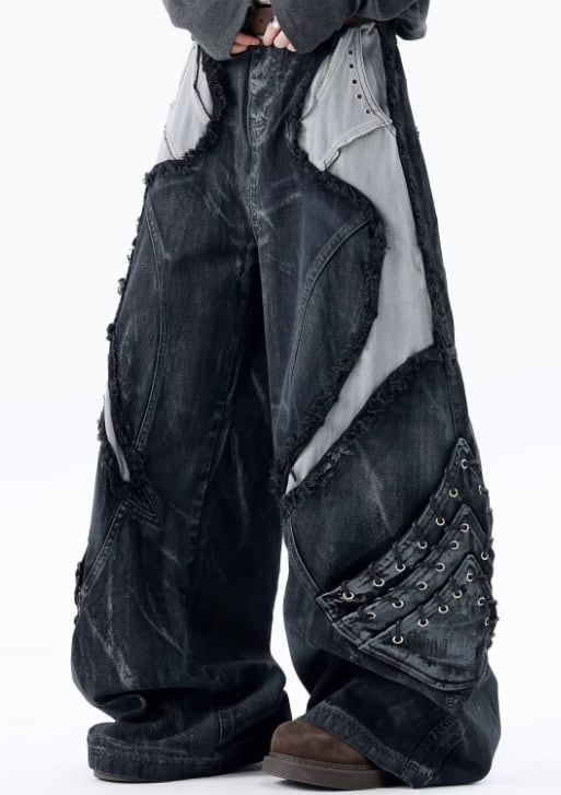 再構築風パンツ バギーパンツ 切替デザイン ダメージ 韓国 ストリート