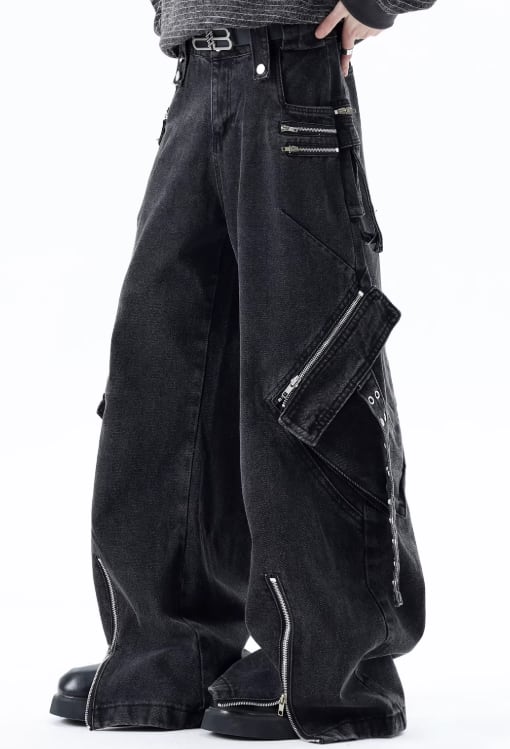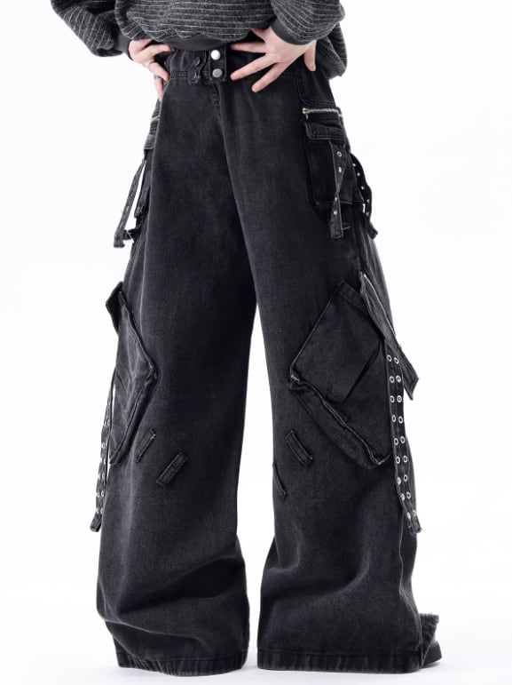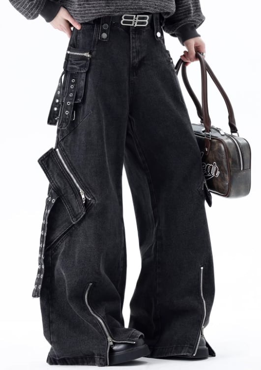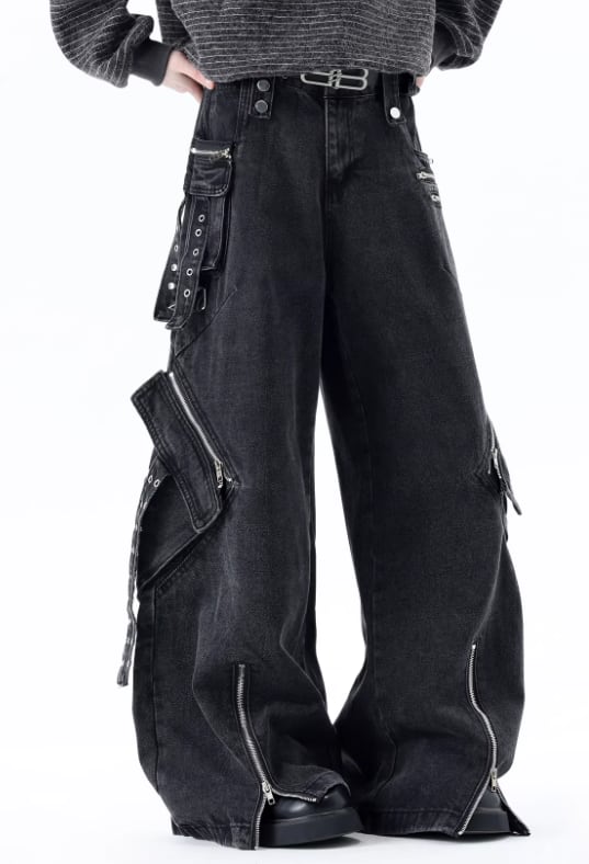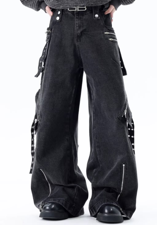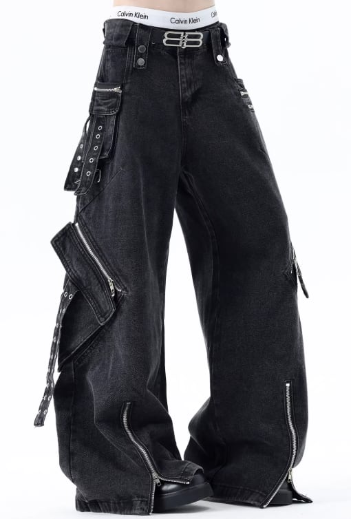 ギミックパンツ サイドベルト 韓国ストリート ブラック カーゴパンツ ジッパー