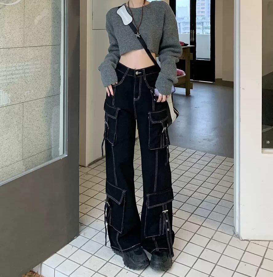 ステッチ ワイドパンツ カーゴパンツ ブラック ポケット ワークパンツ