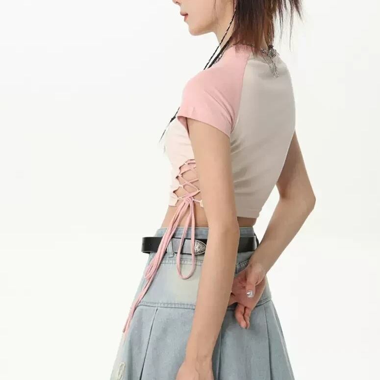 半袖ラグランTシャツ サイドリボン バイカラー ロゴ刺繍 クロップド丈