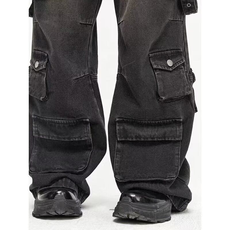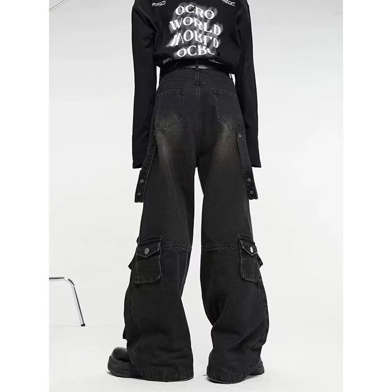カーゴパンツ ブラック サイドベルト ポケット ワイドパンツ ダメージ加工 韓国 ストリート