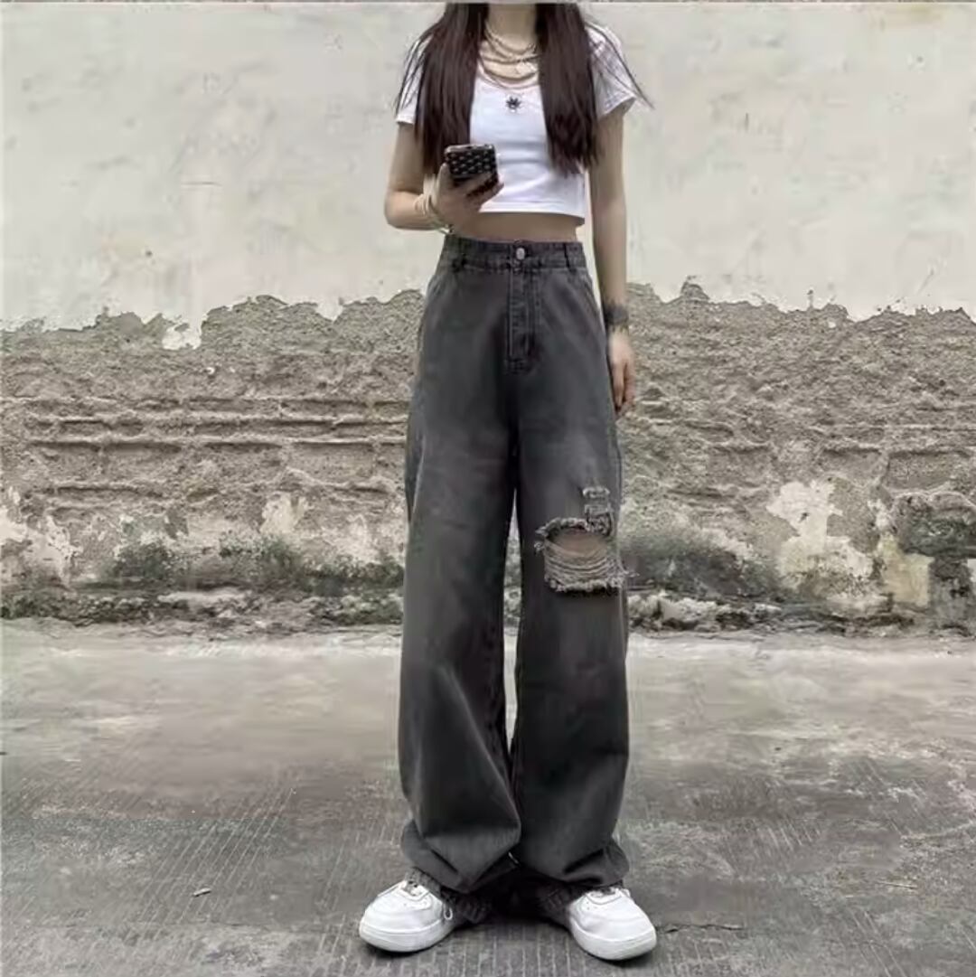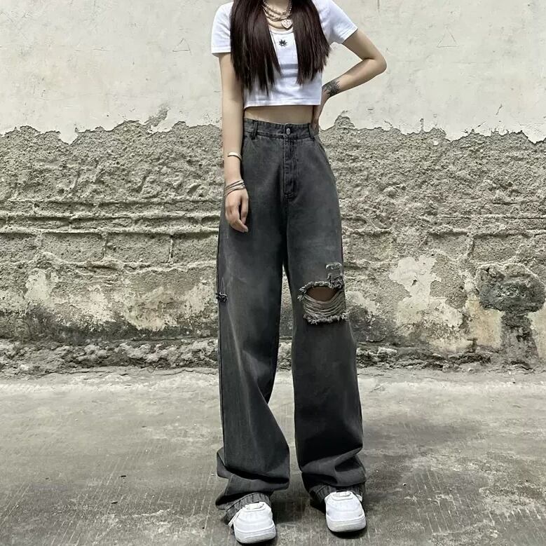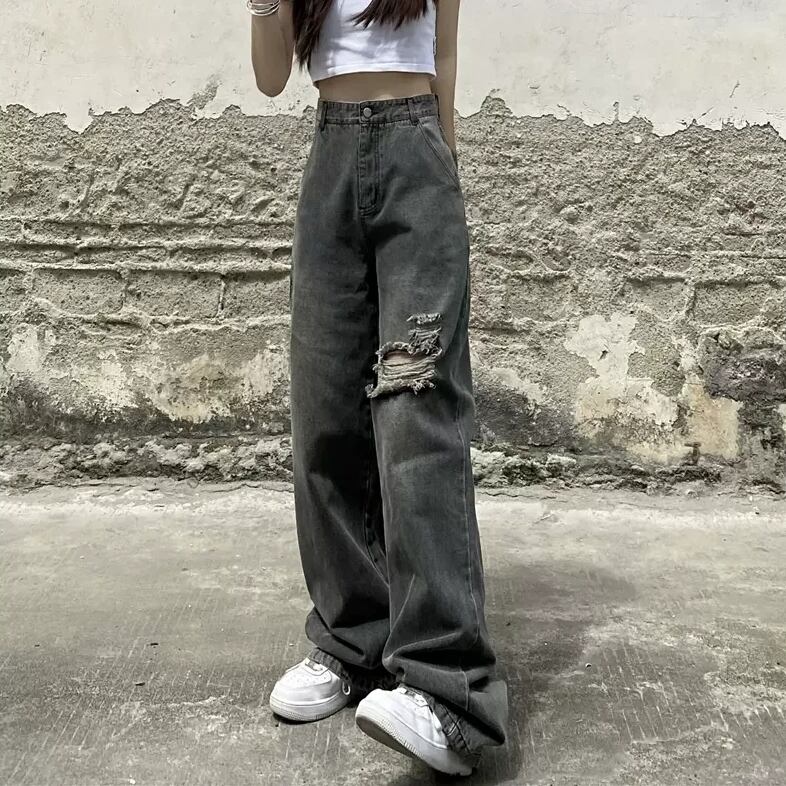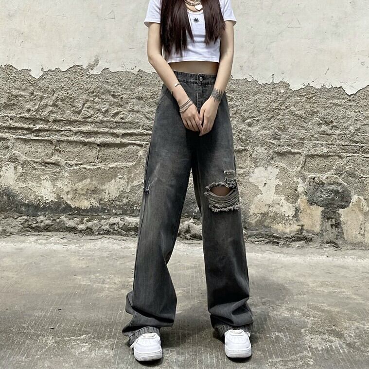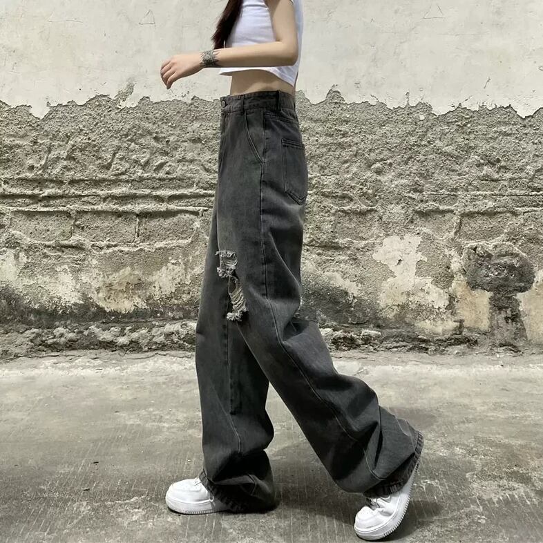 ダメージデニム ワイドパンツ ブラック ダメージ加工 ストリート ルーズデニム 韓国