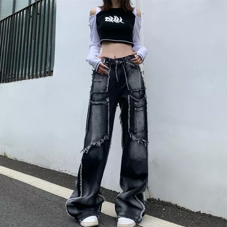 フリンジデニム ヴィンテージ ブラック ダメージ ルーズ ワイドパンツ ストリート 韓国