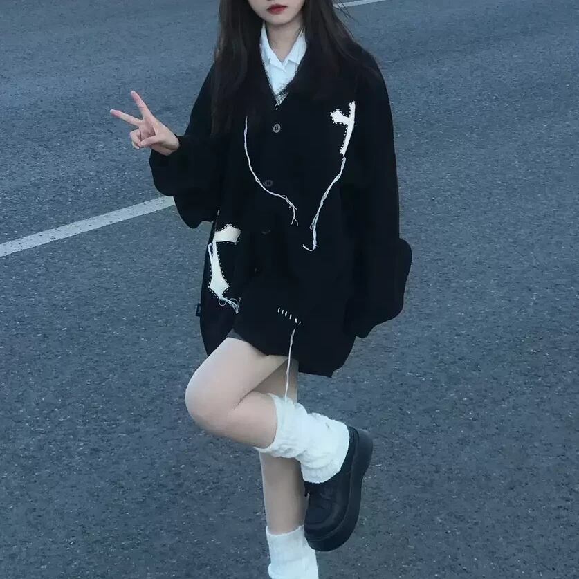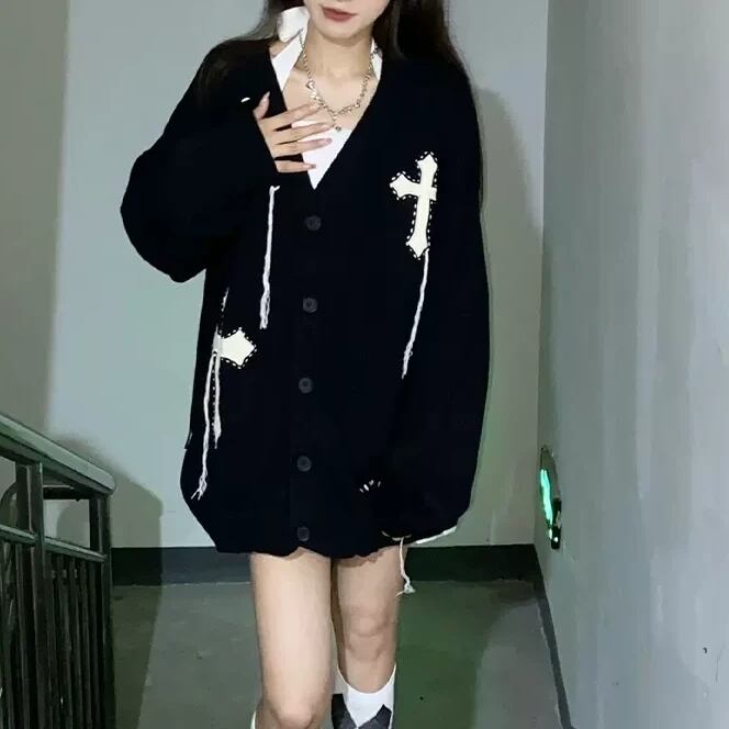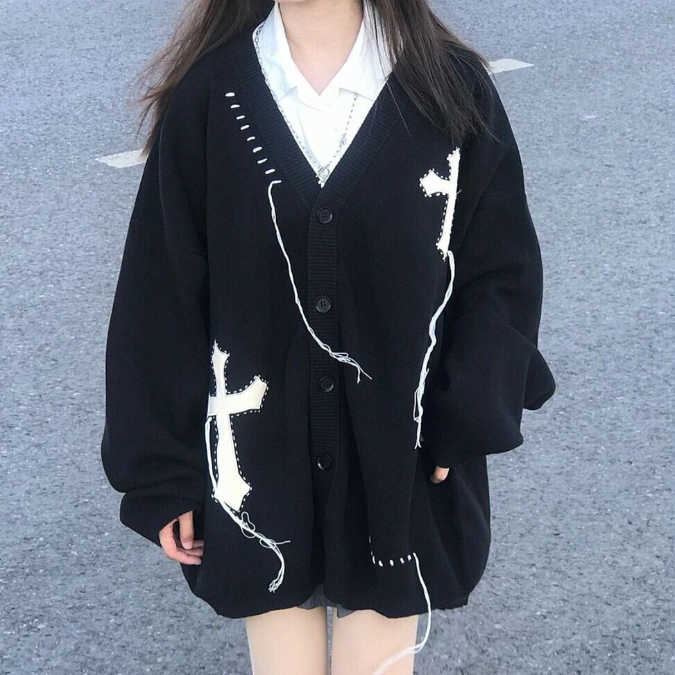 ニットカーディガン クロスデザイン 十字架 ブラック オーバーサイズ ステッチデザイン 韓国