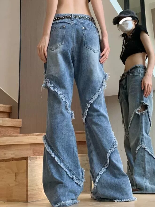 デニムパンツ フリンジ ダメージ加工 ワイドパンツ スタイルアップ ストリート カジュアル