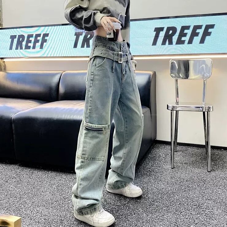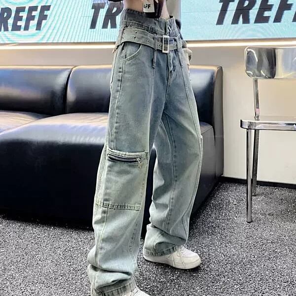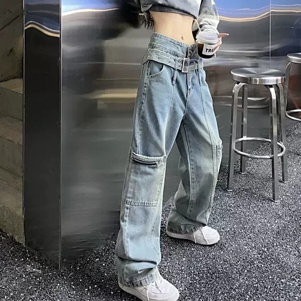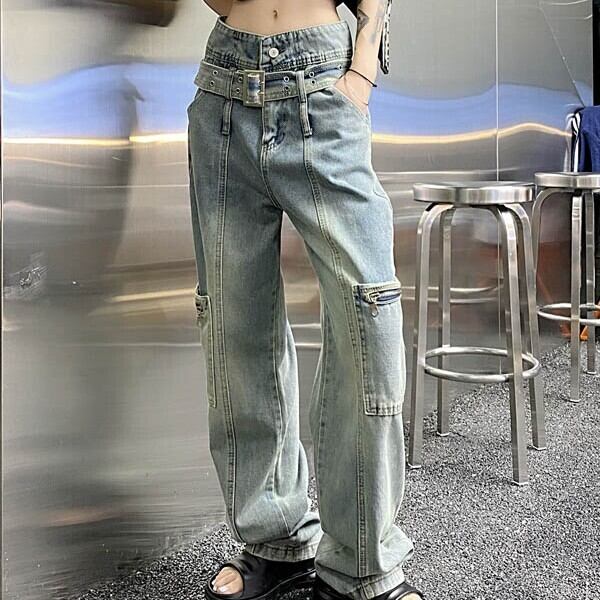 カーゴパンツ デニム ハイウエスト ベルトデザイン ストレートパンツ ステッチ ポケット
