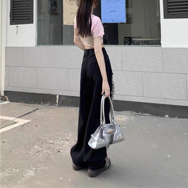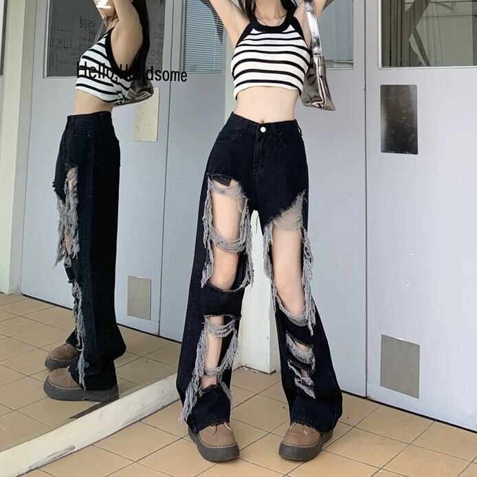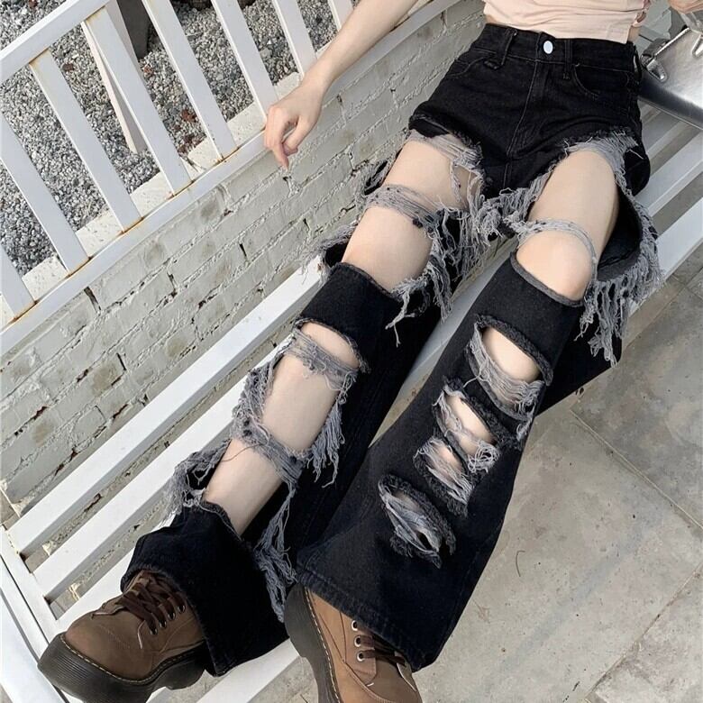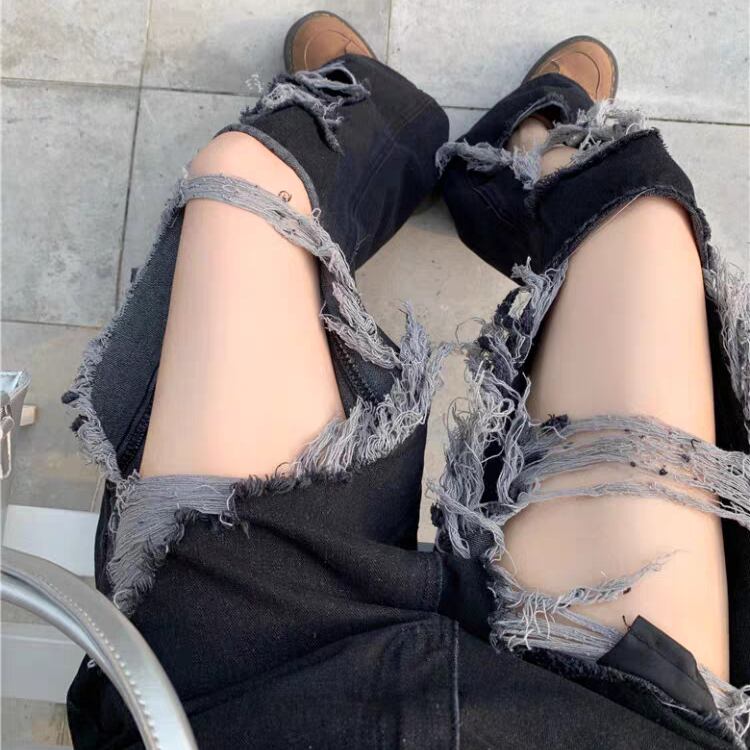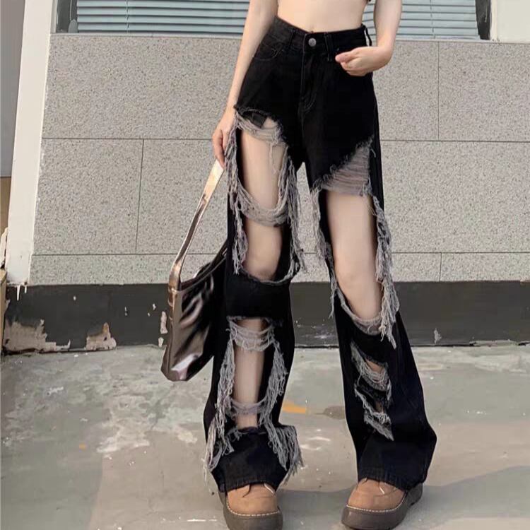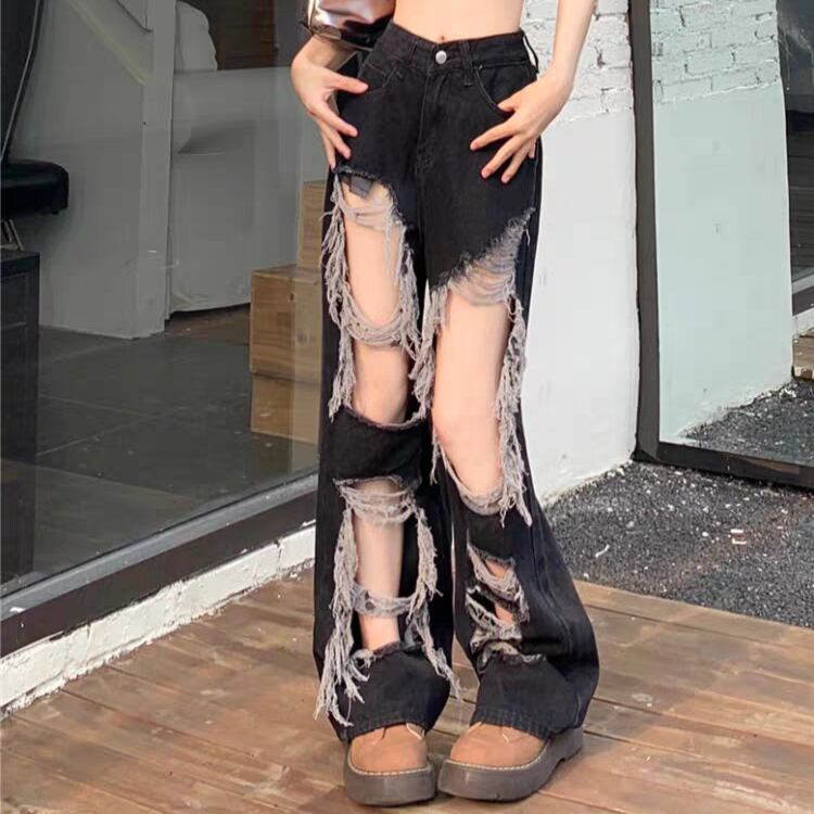 クラッシュデニム ブラック デニムパンツ ダメージ 肌見せ ゆったり