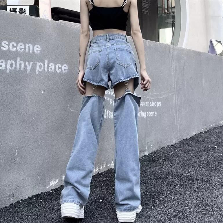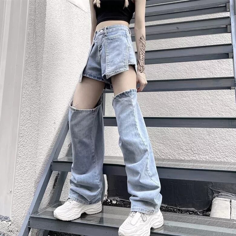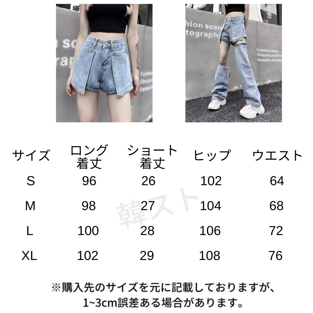 ブルーデニムパンツ カットアウト ショートパンツ 2WAY 金具 ウォッシュ加工 トレンド