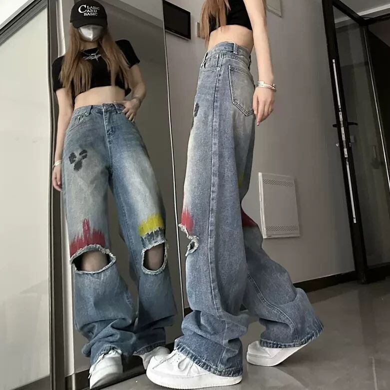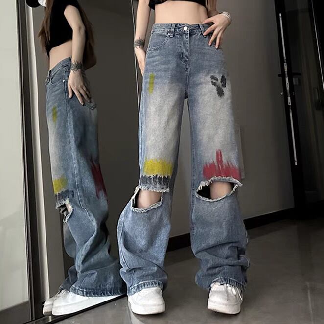 デニムパンツ ペイント ダメージジーンズ スタイルアップ ゆったり ウォッシュ加工