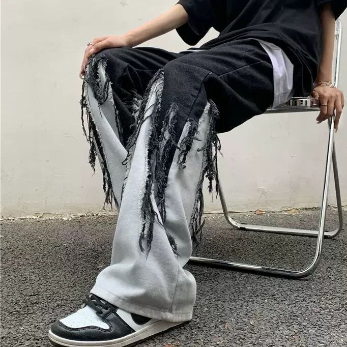 フリンジ デニムパンツ ブラック ウォッシュ加工 切替 ダメージデニム パッチワーク 刺繍