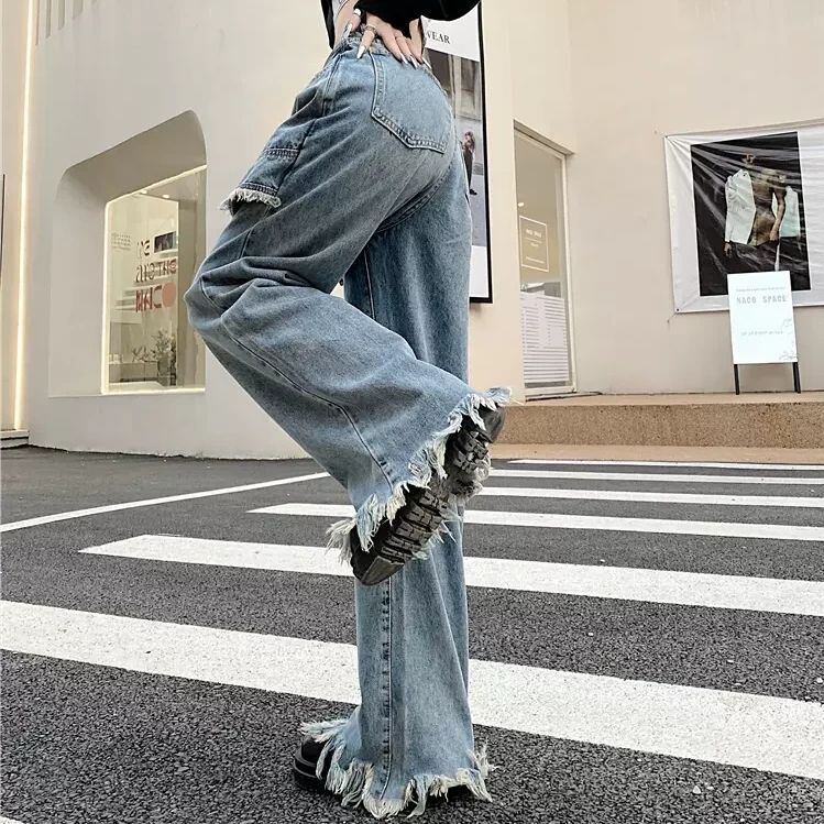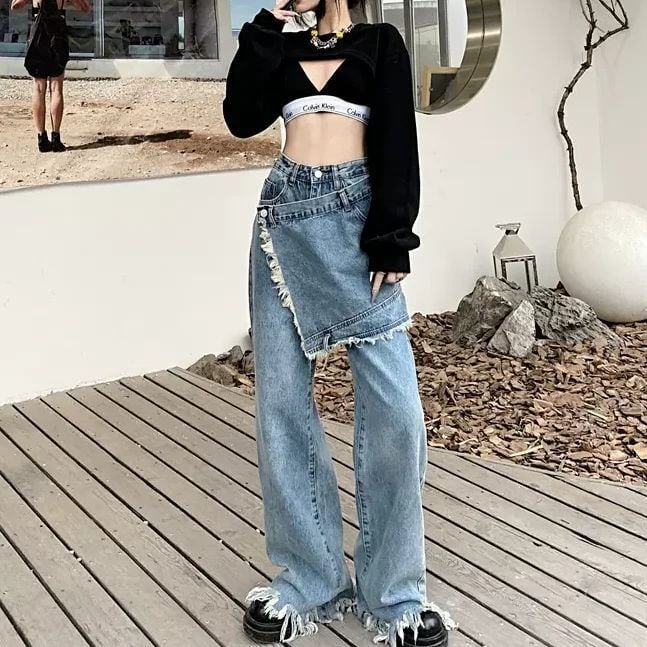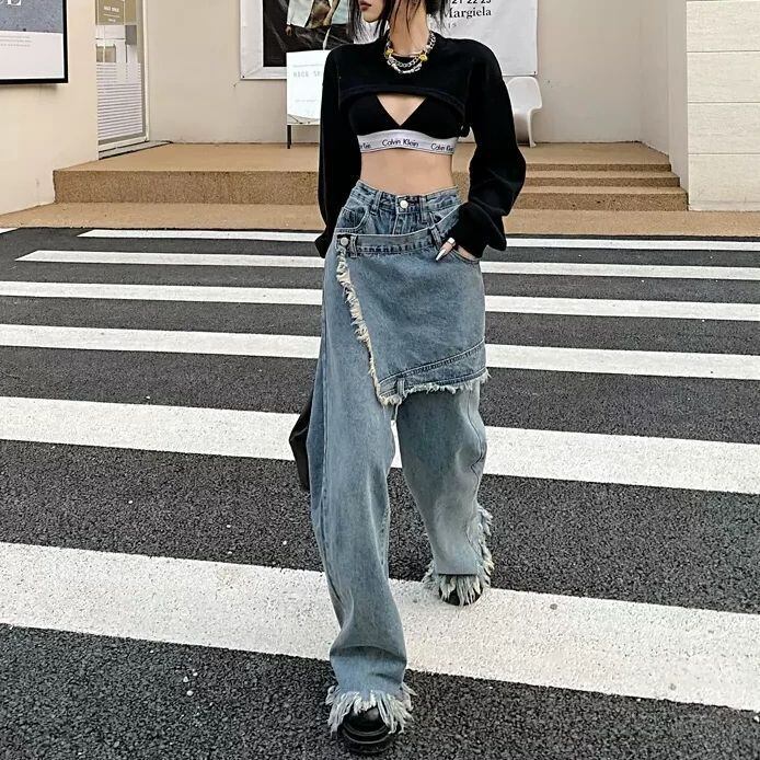 デニムパンツ 巻きスカート風 ドッキング風 フリンジ 切りっぱなし ストリート