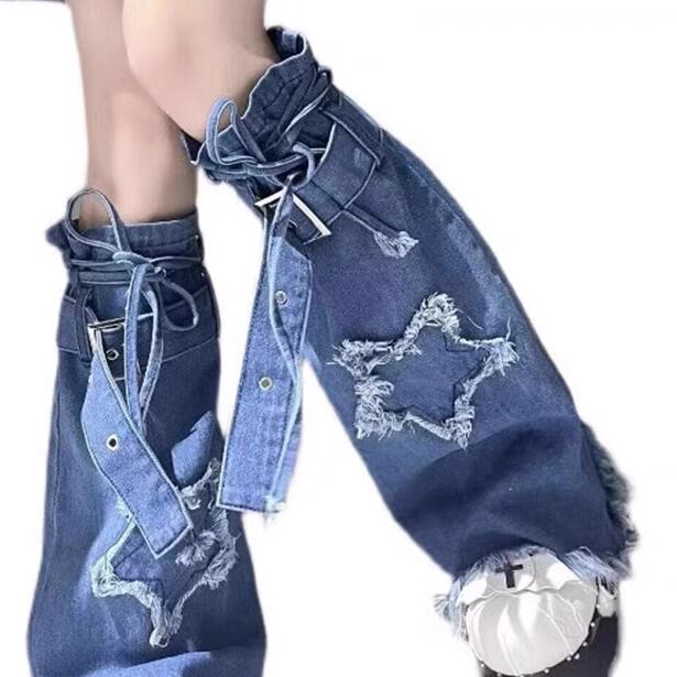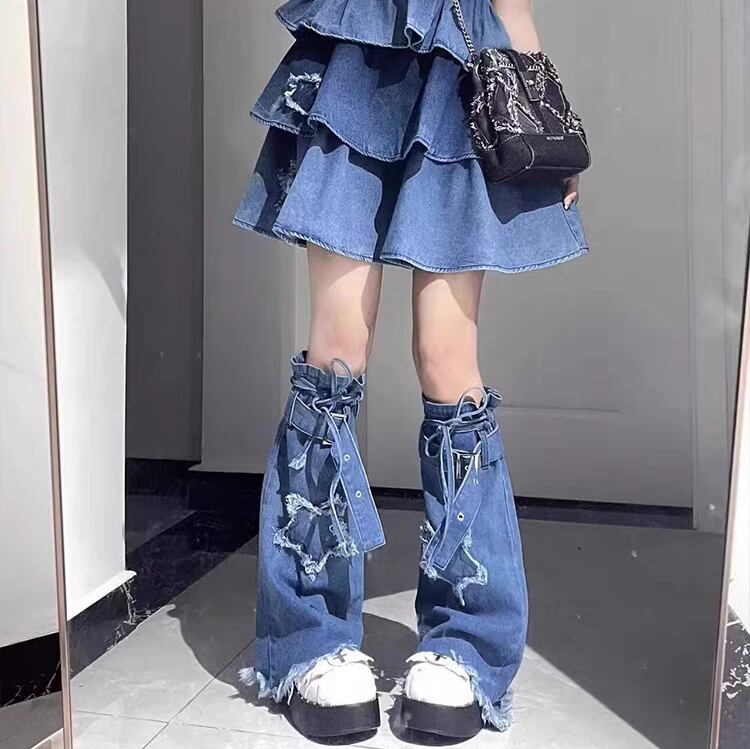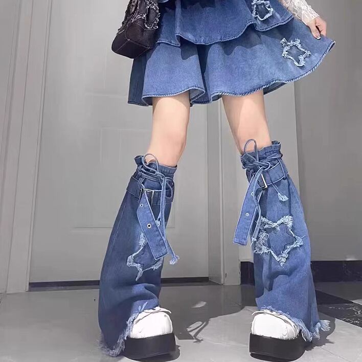 デニム レッグウォーマー ブルー 星 裾フリンジ リボン ストリート