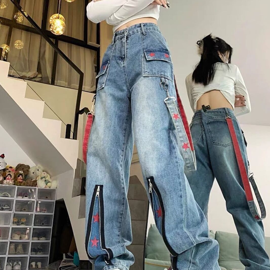 星デニム サスペンダー 裾ジップ 星プリント 薄ブルー ウォッシュド加工